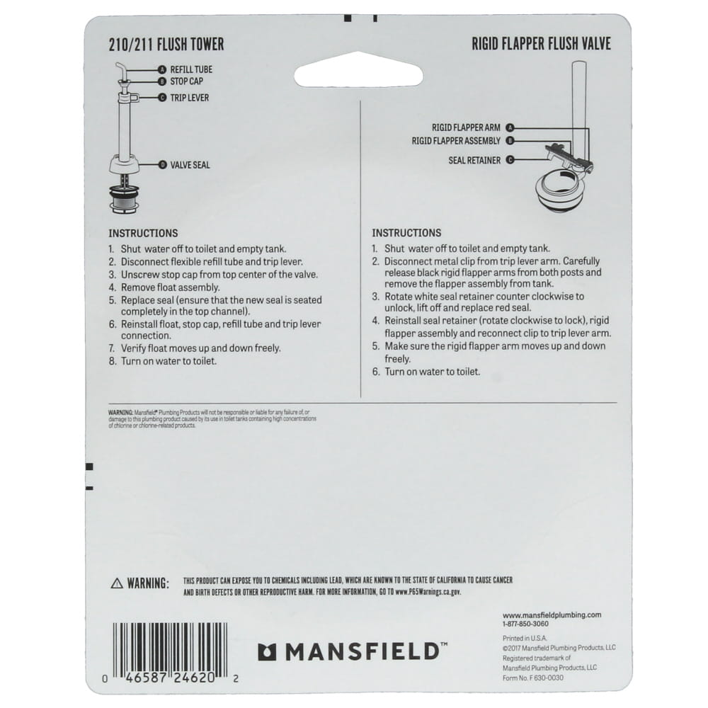 Mansfield Genuine 630-0030 Flush Valve Seal The Red Seal Is The Only Seal To Fit The Tower Flush Valve, and the ridged Mansfield flappers. The Mansfield 006300030 210/211 Flush Valve Seal UPC: 046587000088. This seal is flat. After being used it may develop a ridge or cone shape. It is the most common cause of the toilet leaking and being hard to flush. When installing it please watch the installation video by clicking the image. The package says for 210 and 211 it is referring to the flush valve model number not the tank number so it is also the seal for the 160 because the 160 uses the 211 flush valve. This seal is made of a special compound that lasts longer than the silicone and other knock offs. The flush valve requires a soft surface to make a seal but it also needs to be firm enough to support the weight of the flush valve.