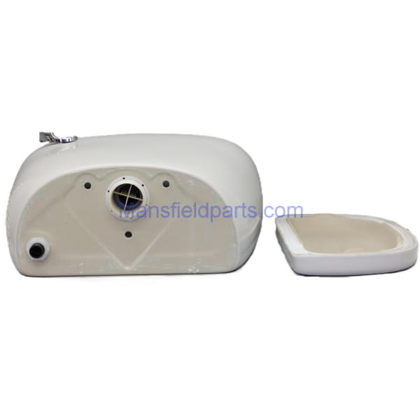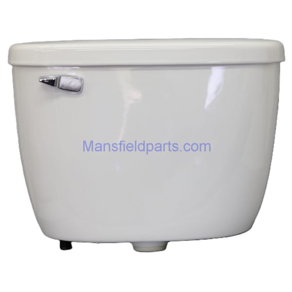Genuine Mansfield 125 white toilet tank. This tank comes complete with the flush valve, fill valve, lever, tank to bowl kit and the tank lid. Another part number for this product is 125010000. To install the complete tank the first thing you will need to do is, shut off the water supply, and remove the existing tank. Once you have done this you will need to flush the stop out. You can do this by placing the end of the supply line into an empty bucket, and turning the water supply on. Allow the water to run for a few seconds, and then shut it back off. It is recommended to repeat this process at least 2 to 3 times. This insures that no debris that is in the supply line flows directly into the new fill valve. The next step is to stretch the tank to bowl gasket around the nut of the flush valve at the bottom side of the tank. Then you will just need to line up the bolt holes in the tank with the holes in the bowl, and tighten the bolts down. The final step is to turn the water supply on, and test for leaks.